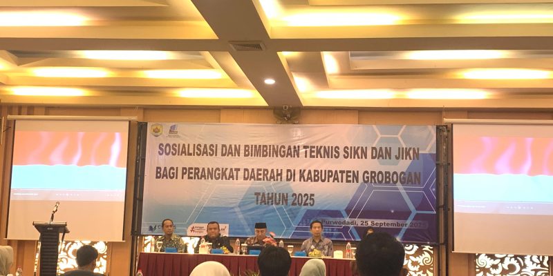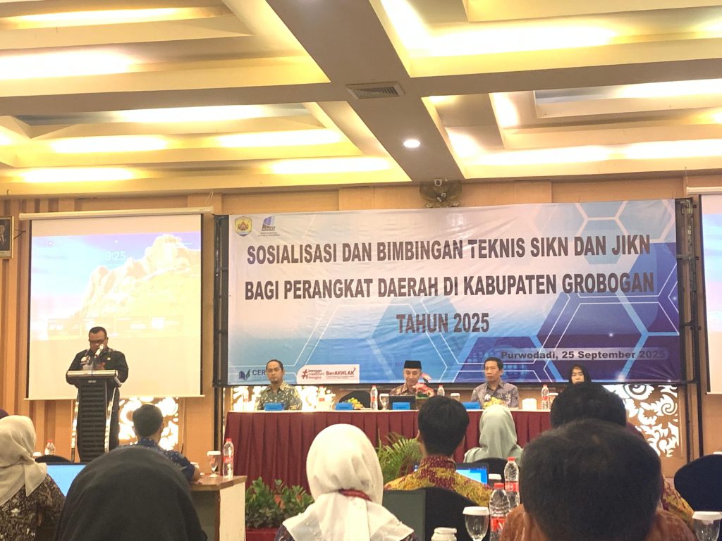 Grobogan – Dinas Komunikasi dan Informatika (Diskominfo) Kabupaten Grobogan menghadiri undangan kegiatan Sosialisasi dan Bimbingan Teknis (Bimtek) Sistem Informasi Kearsipan Nasional (SIKN) dan Jaringan Informasi Kearsipan Nasional (JIKN) yang diselenggarakan Oleh Dinas Kearsipan dan Perpustakaan Daerah Kabupaten Grobogan yang bertempat di Hotel 21 Purwodadi 25/9/2025. Kegiatan ini bertujuan untuk memberikan pemahaman dan keterampilan teknis kepada aparatur pemerintah daerah dalam mengelola arsip berbasis digital sesuai dengan standar nasional. Dengan adanya penerapan SIKN dan JIKN, pengelolaan arsip dapat dilakukan lebih efektif, transparan, serta mendukung percepatan transformasi digital pemerintahan.